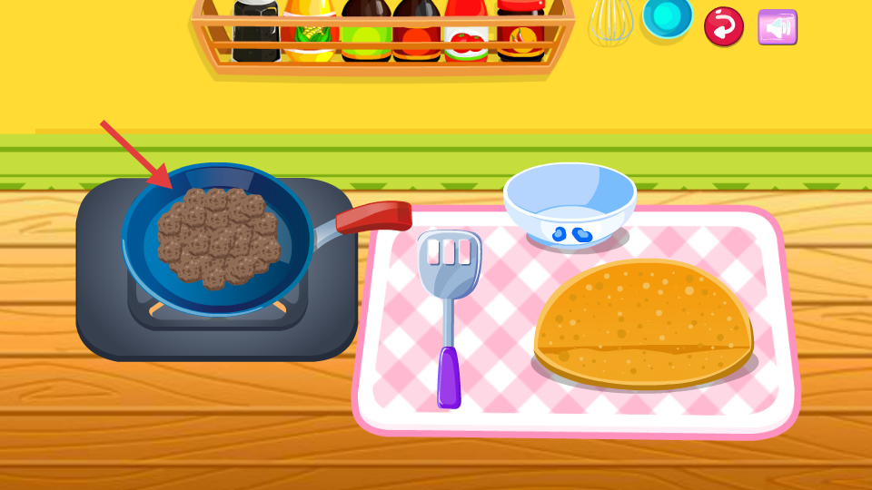 2、在烹饪界面,选取碗中的食材(如肉丸),放入锅中。
