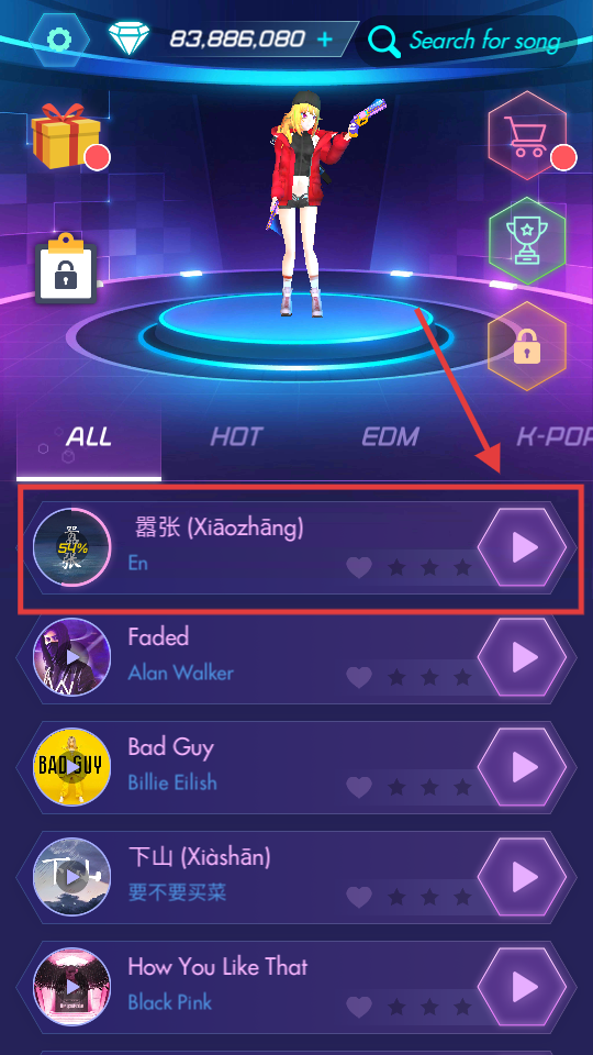 1、在歌曲列表选【嚣张(Xiaozhang)】等歌曲,点击播放键开启音乐射击挑战。