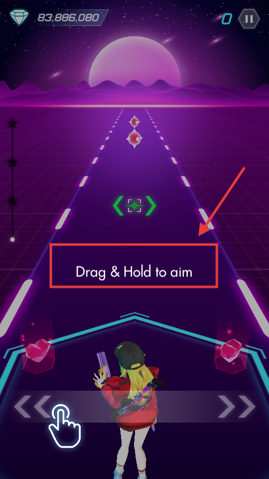 2、按【Drag&Hold-to-aim】提示,拖动并按住瞄准,配合节奏射击前方目标。