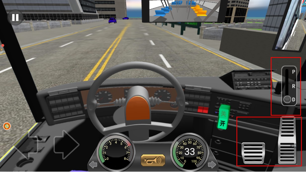 3、驾驶时,通过右侧的挡位调节区域,选择合适挡位;利用下方的踏板,控制车辆的加速与减速。