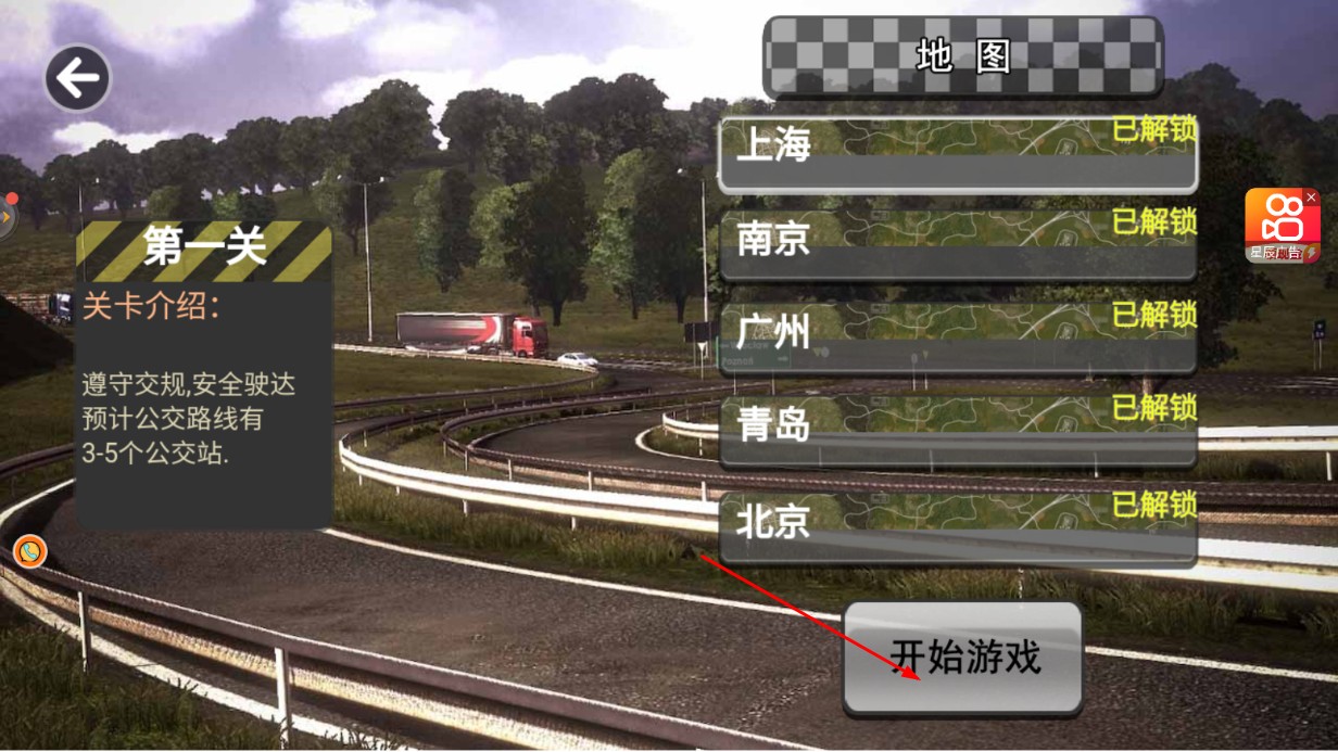 2、在关卡选择界面,可看到上海、南京、广州、青岛、北京等已解锁城市,点击“开始游戏”,进入对应关卡。