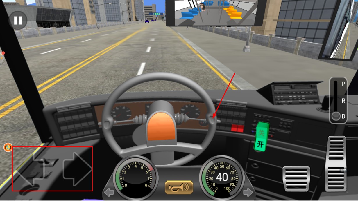 4、借助左侧的方向按键,操控车辆转向,在道路上安全行驶,遵守交规,按公交路线行驶并停靠公交站。