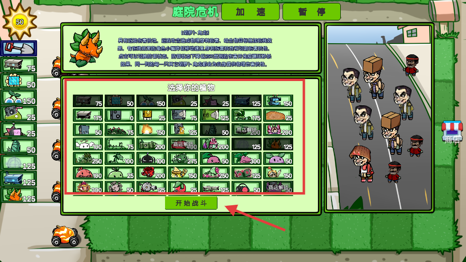2、在【选择你的植物】界面,搭配产阳光-攻击类植物,点击【开始战斗】进入关卡。