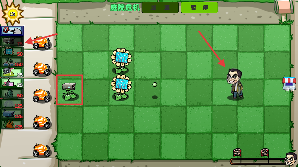 4、积累阳光后种【攻击植物】,攻击来袭的【僵尸】,筑牢防线,逐步消灭敌人。