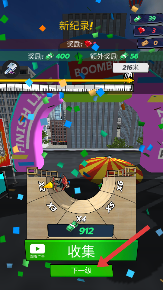 4、游戏结束,若打破记录,点击【下一级】按钮,解锁新内容并挑战更高难度关卡。