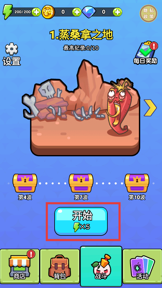 1、点击【开始-×5】按钮,消耗5【闪电】进入【蒸桑拿之地】关卡,开启塔防挑战。