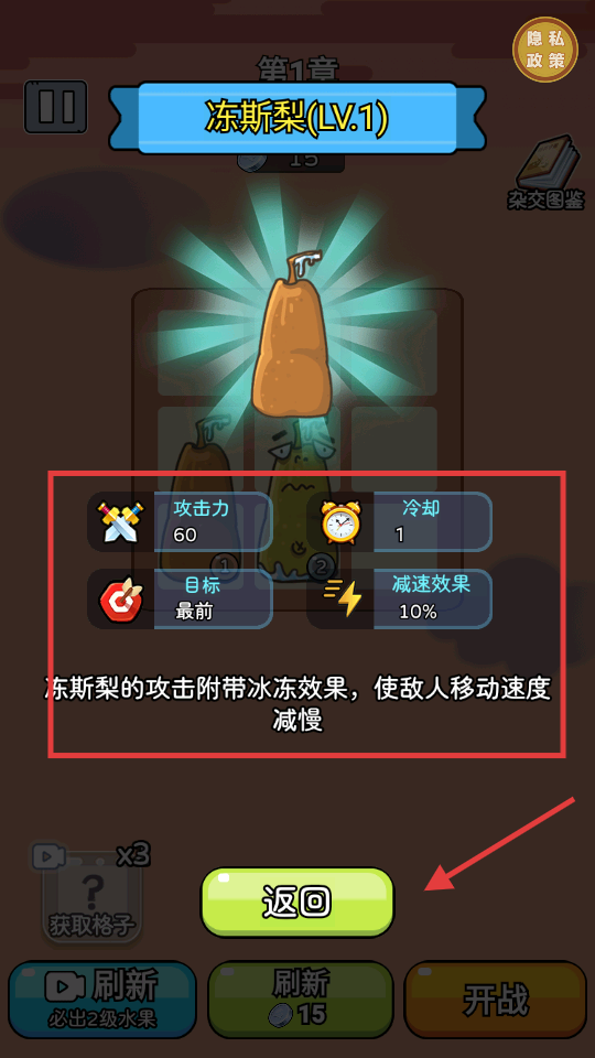 2、了解【冻斯梨-LV.1】属性(攻60-冷1-最前-减速10%),借冰冻减速,点【返回】备战。