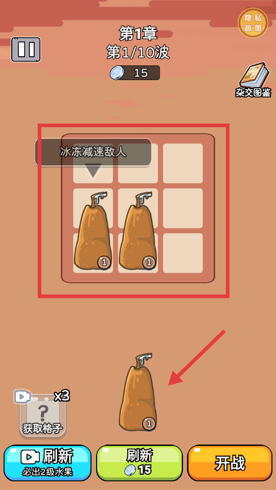 3、将【冻斯梨-1级】放置阵中(已有两个),利用冰冻减速敌人,增强防线。