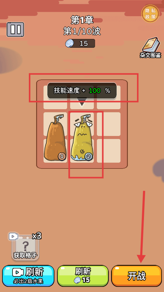 4、合成【1级+1级】豆丁获【2级】(技能速度+100%),点击【开战】迎敌。