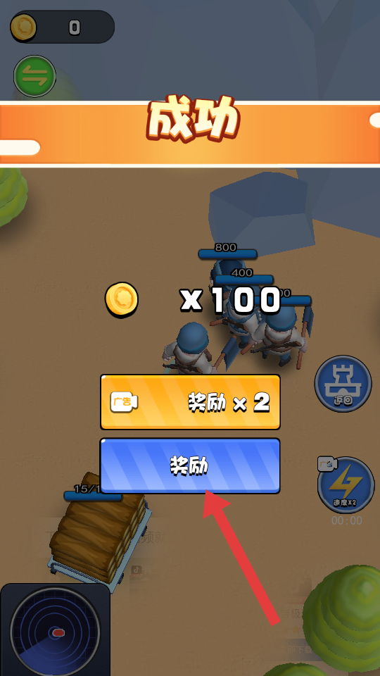 4、成功获胜出现【成功】提示后,点击【奖励】按钮,获取金币等奖励,进入新关卡。