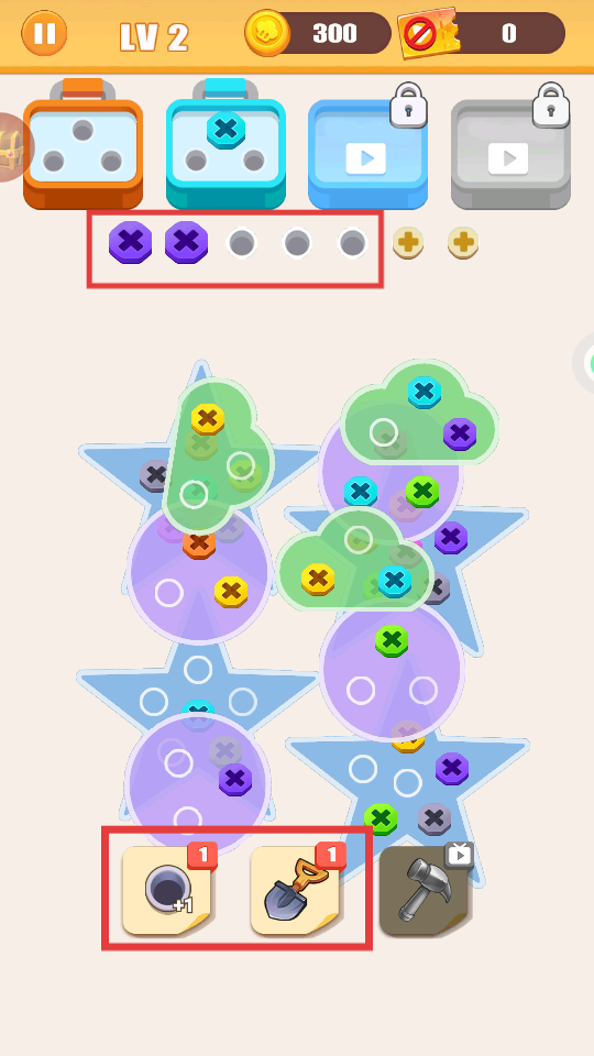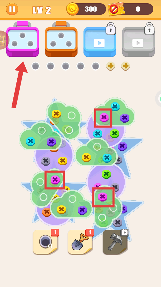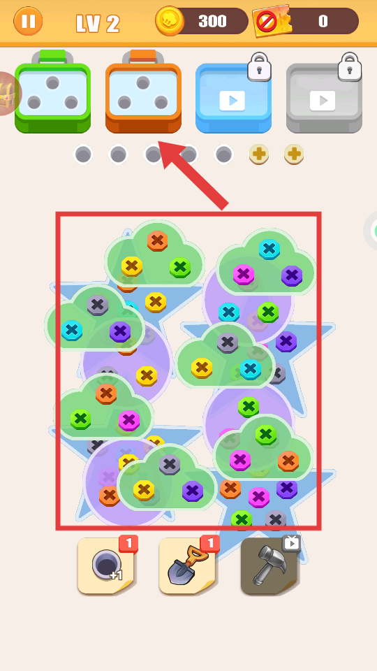 1、在【LV-2】关卡中,观察红框内【彩色螺丝】分布,对应上颜色箱子进行消除。