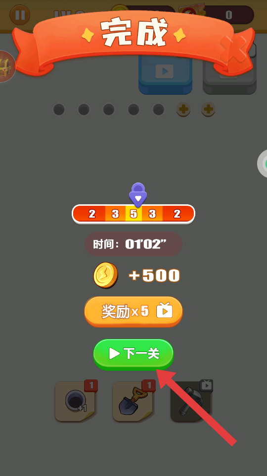 4、成功完成关卡出现【完成】提示后,查看获得的【金币】奖励,点击【下一关】按钮,挑战新关卡。