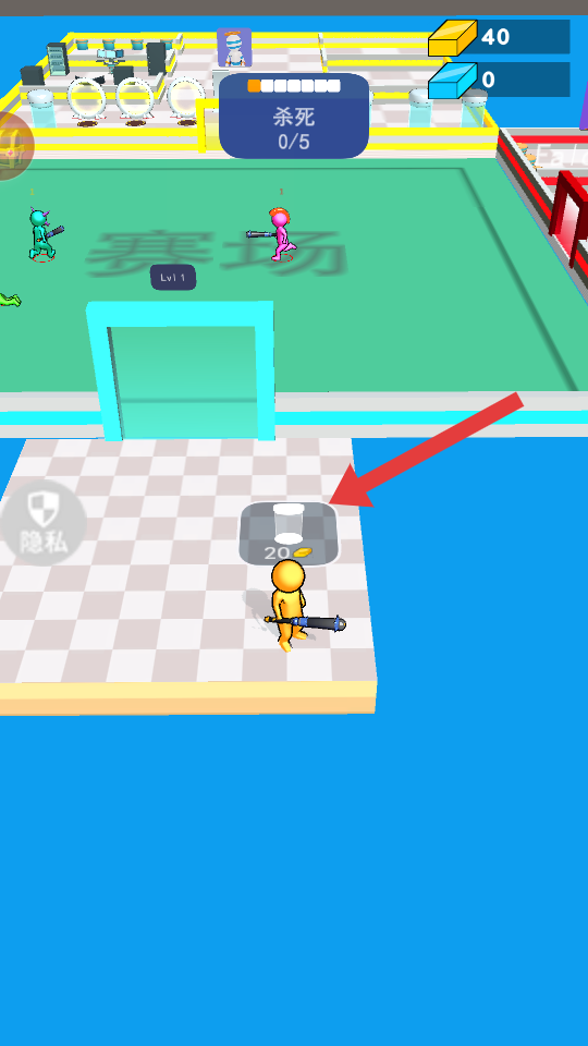 1、进入游戏后,滑动屏幕操控【黄色小人】角色,移动至红箭头所指的【20金币】,花费金币进行建造复制台。
