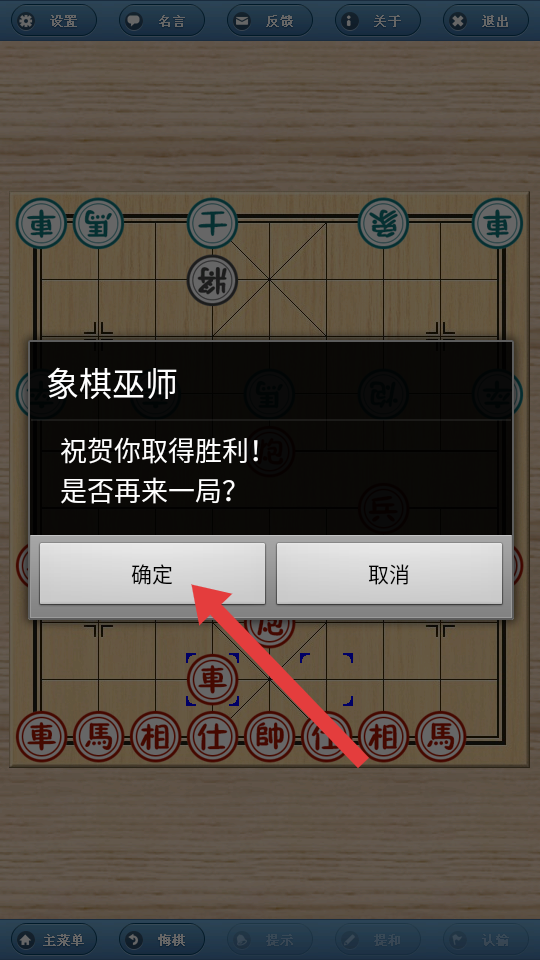 4、成功将对方【将】或【帅】逼入绝境,取得胜利后,出现【象棋巫师-祝贺你取得胜利!是否再来一局?】提示,点击【确定】可开始新一局游戏。