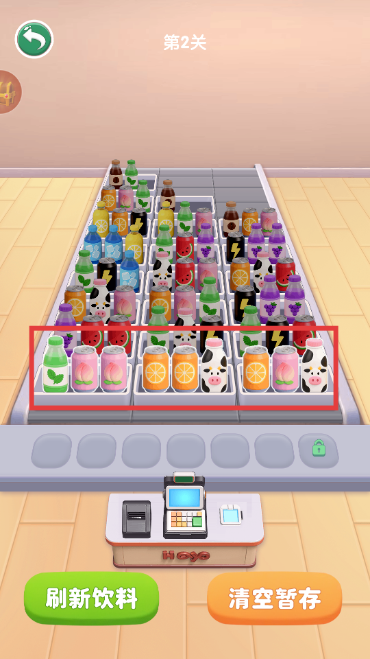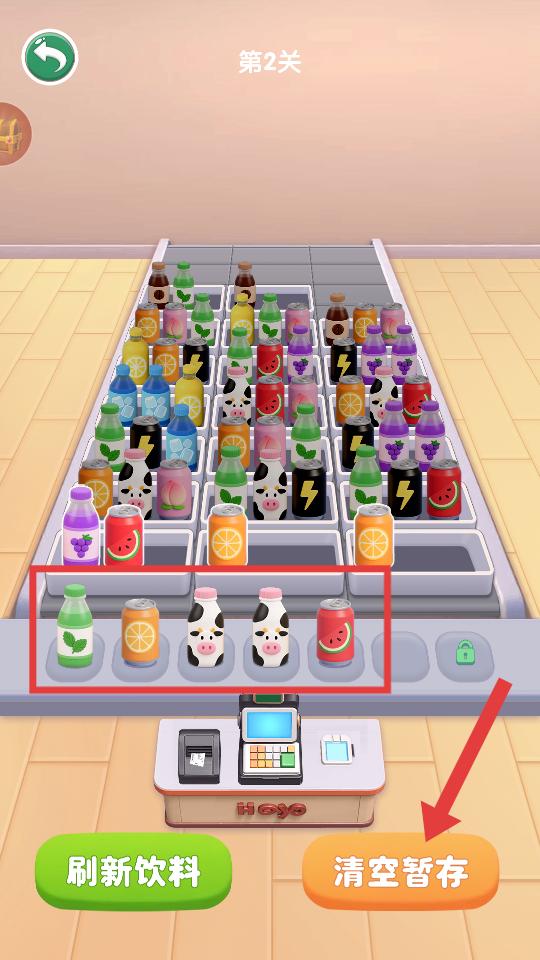 2、进入【第2关】后,观察方框内货架上的饮料,找到三个相同的饮料,点击即可消除。