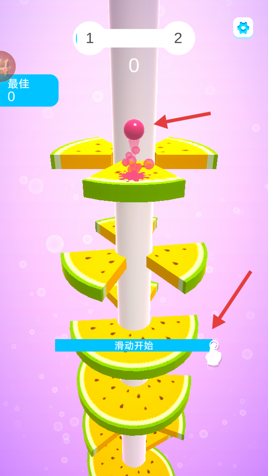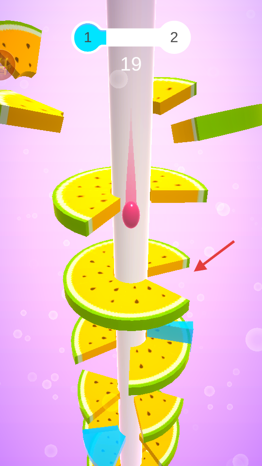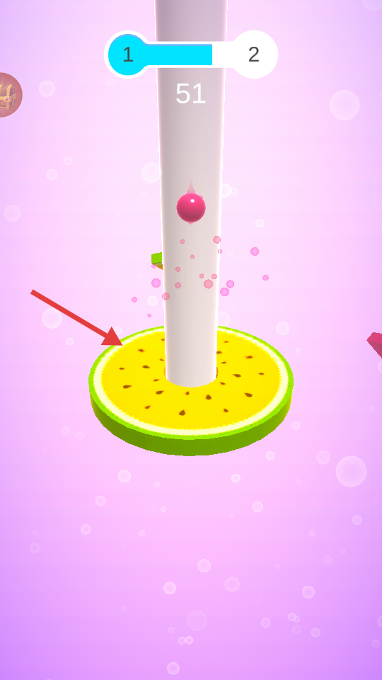 2、控制粉色小球穿过带有缺口的西瓜切片,持续下落积累分数。