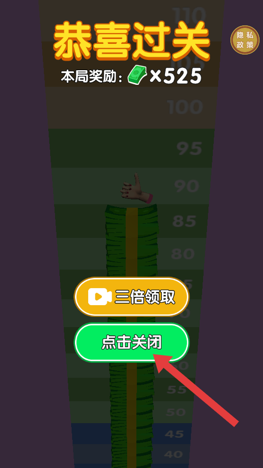 4、成功到达终点后,出现【恭喜过关】提示,点击【点击关闭】,关闭界面准备进入下一局游戏。