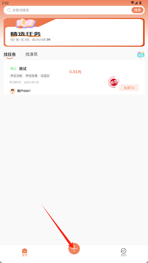 3、首页“发任务”卡片是核心入口,用于发布需求并寻找合适的声音提供者。