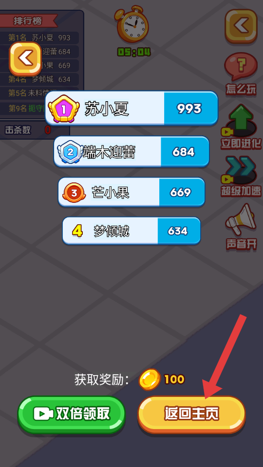 4、游戏结束后查看排行榜成绩,若想再次挑战,点击【返回主页】后重新点击【开始游戏】即可。