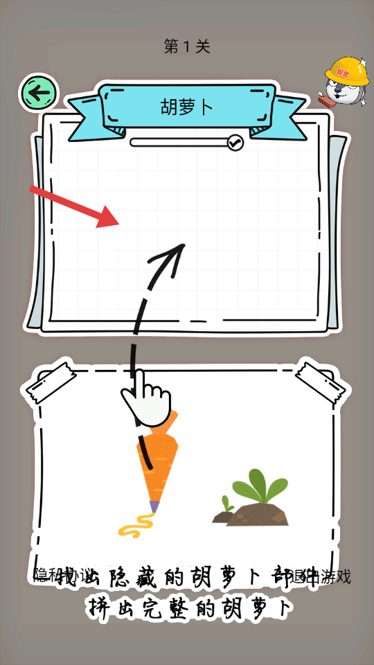 2、在第1关,按照指引画出隐藏的胡萝卜部分,拼出完整的胡萝卜图案。