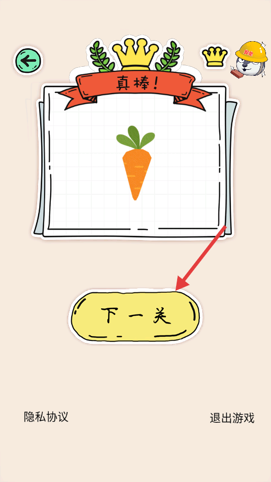 3、成功拼出胡萝卜后,点击【下一关】按钮,进入第2关继续挑战。