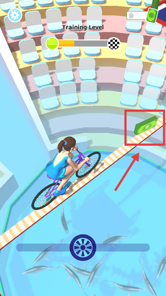 2、骑行过程中,收集道路上的绿色钞票道具,积累游戏资源。