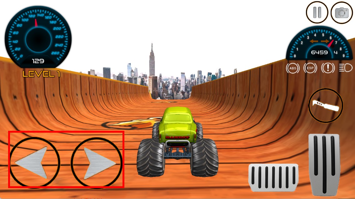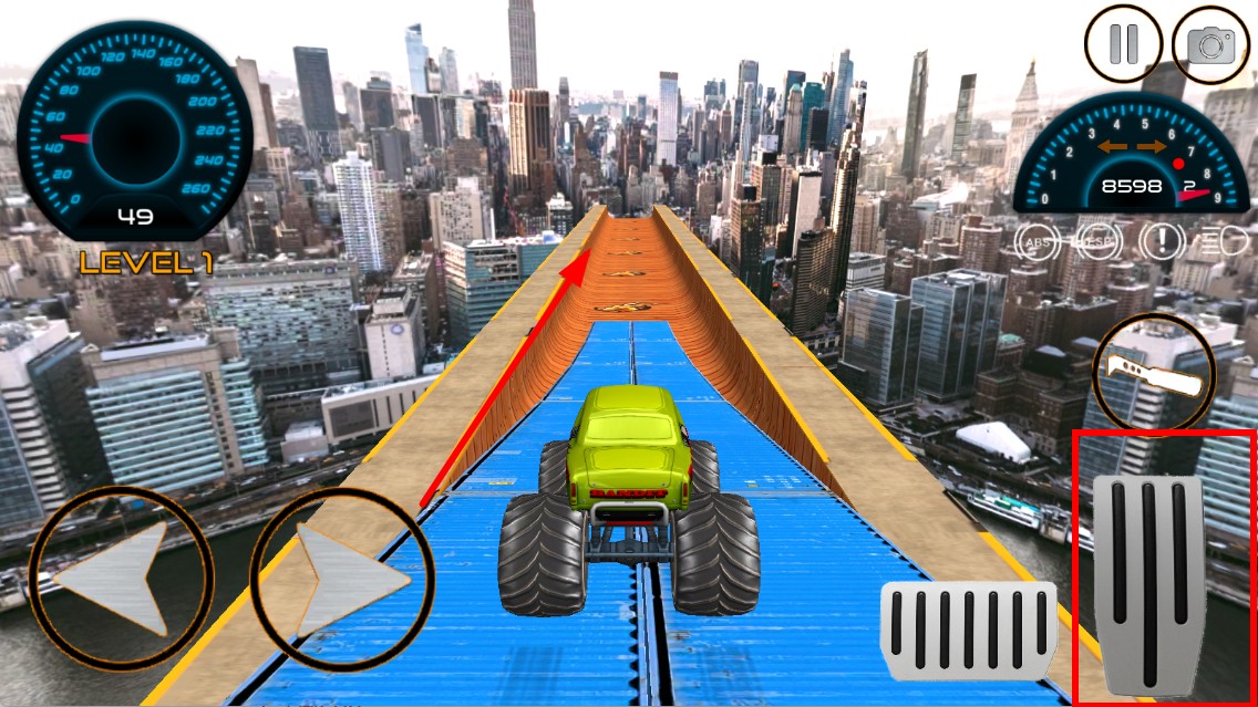 3、点击右侧油门按键,可让大脚车加速,在城市高空赛道上行驶。