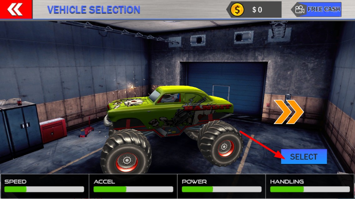 2、在车辆选择界面,点击【SELECT】按钮,选择绿色的大脚车。