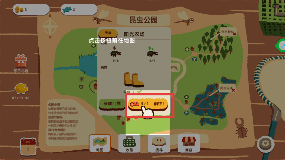 2、点击【前往】按钮,消耗对应门票,进入阳光农场的抓虫场景。