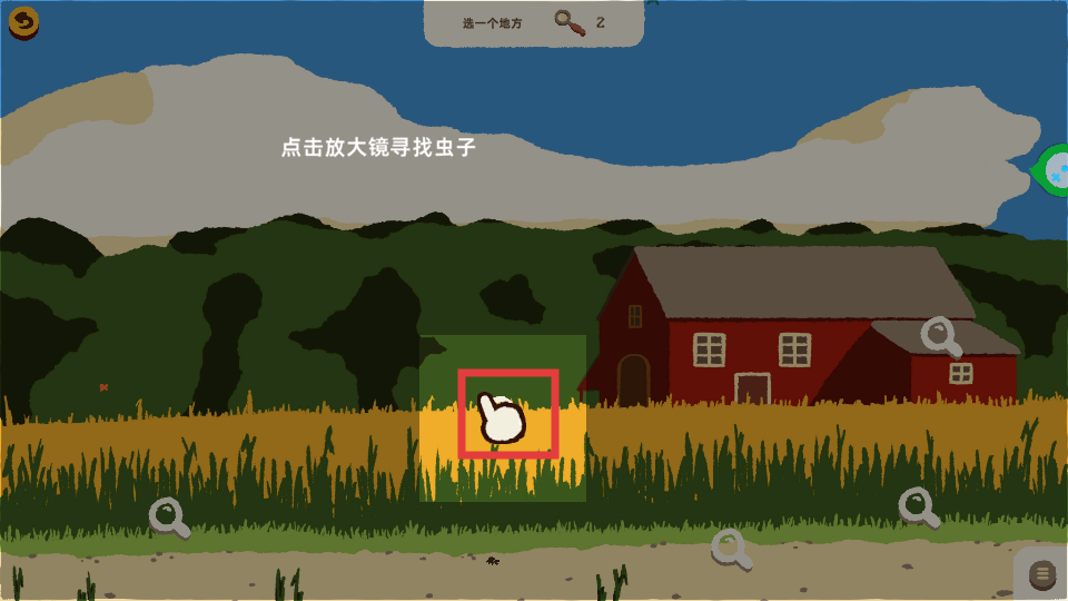 3、进入农场后,点击放大镜图标,在草地等区域搜寻虫子的踪迹。