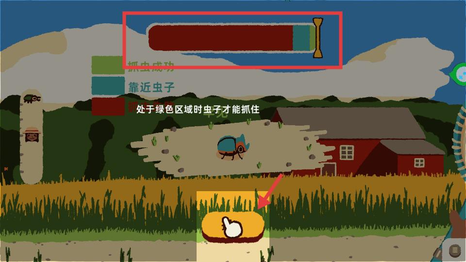 4、留意上方进度条,当进度条处于绿色区域时,点击抓虫按钮,尝试成功捕获虫子。