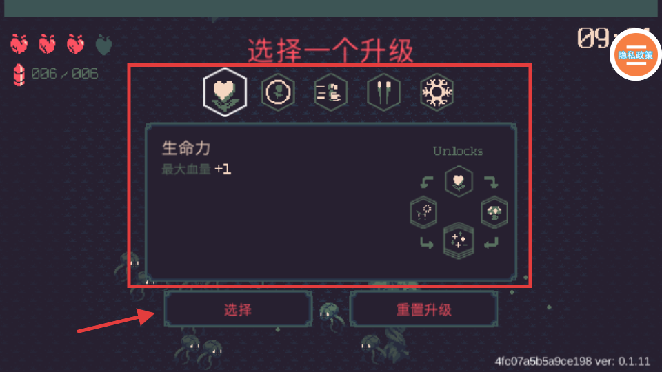 4、升级时优先选【生命力】(最大血量+1),点击【选择】增强生存,为后续战斗筑牢基础。