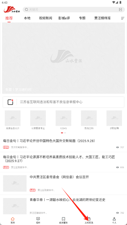 《山水贾汪》是贾汪区官方综合性信息服务平台。软件特色是深度融合新闻资讯、政务公开与文明实践,亮点在于整合电视直播与本地视听资源,可实时收看“贾汪新闻”等节目,并设有便捷的违法信息举报入口。平台优势是构建了完整的文明实践参与通道,支持活动点单、志愿者招募等互动功能。核心服务覆盖新闻搜索、政务信息公开、文明实践信息发布与个人服务,实现信息一站获取。