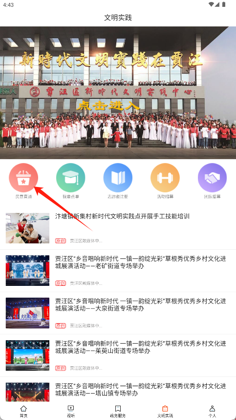 1、在软件首页底部导航栏点击“文明实践”按钮进入。