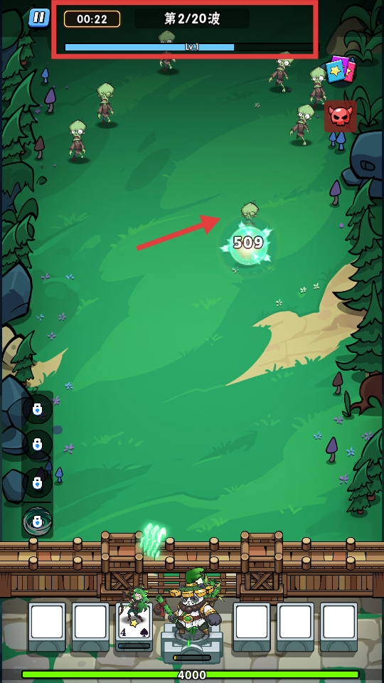 2、战斗时关注波次进度(第【2/20】波)与伤害(【509】),利用已部署卡牌输出,快速清理当前波次僵尸。