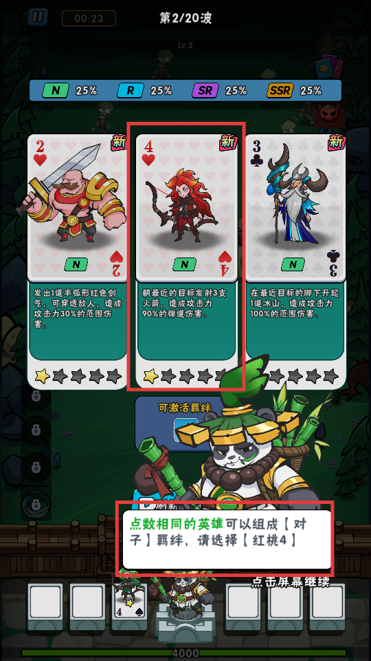 1、开局选卡优先考虑【N】级【4-黑桃-弓箭手】,朝最近目标射箭造成90%弹道伤害,高效应对初期僵尸。
