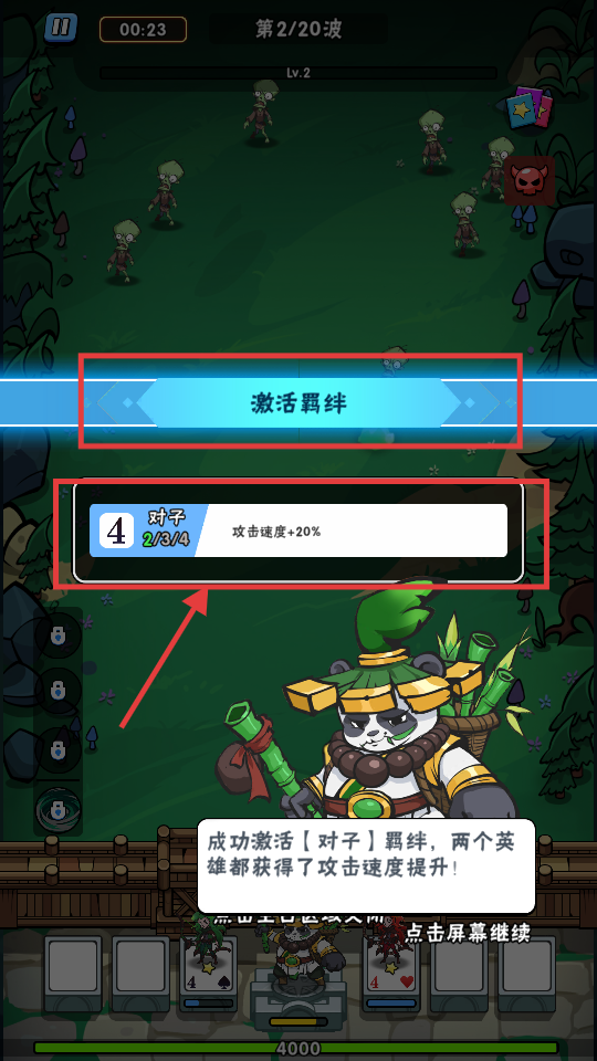 4、激活【对子】羁绊后,英雄获得【攻击速度+20%】加成,提升输出效率,助力应对后续僵尸波次。