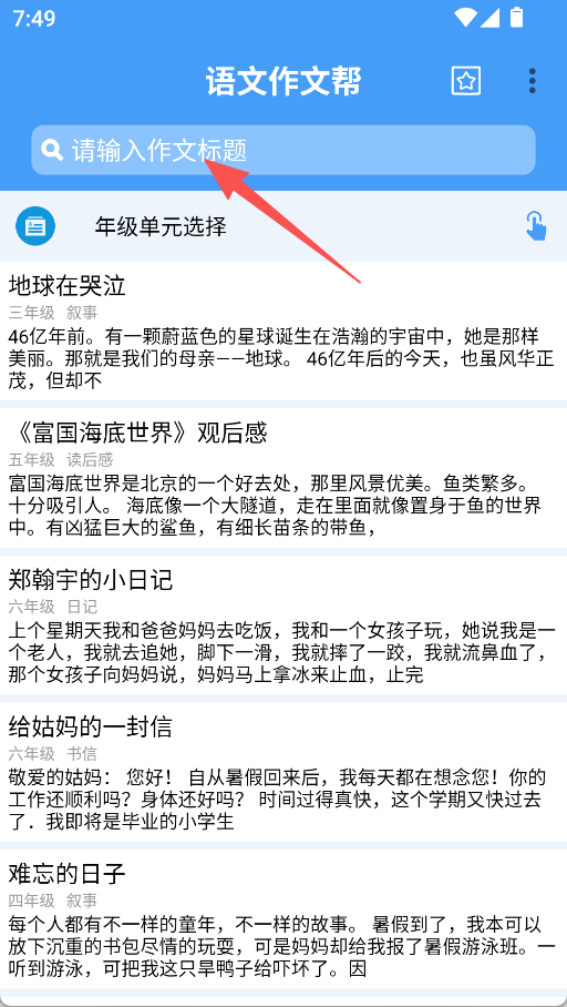 《语文作文帮》提供丰富作文资源,涵盖不同年级与多种作文类型,如写人、叙事、写景、日记、书信等。拥有大量高分作文,可同步教材习作学习。支持搜索作文标题快速查找,也能按年级、作文类型筛选,方便找到合适的作文范例,助力作文写作学习。