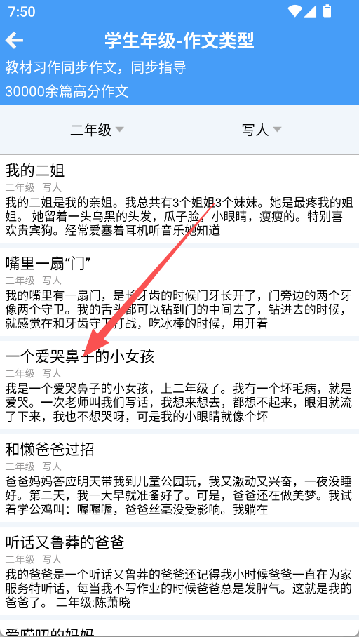 2、可选择年级与作文类型,比如选定二年级、写人类型,筛选出对应作文。