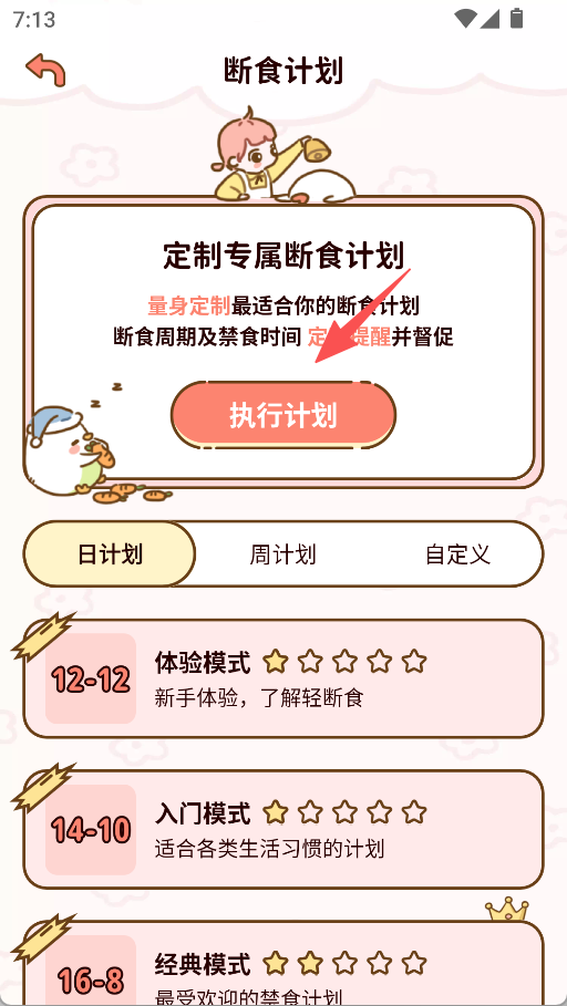 2、在断食计划页面,定制专属断食计划,点击 “执行计划”。