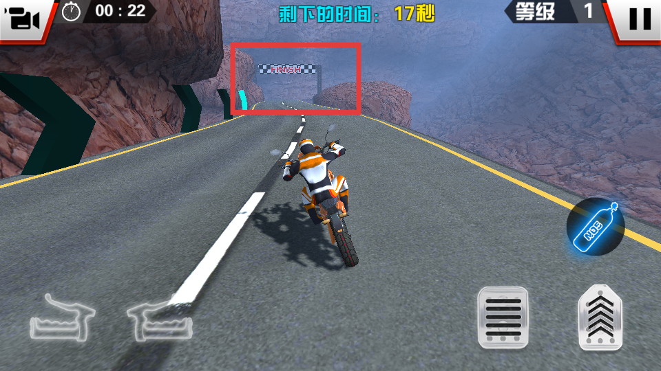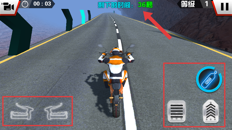 2、进入游戏后,注意屏幕上方的【剩下的时间】,利用左下角【左右】按钮、右下角的【刹车和油门】操控摩托车。