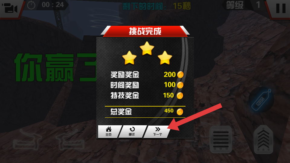 4、成功抵达终点完成挑战,查看【挑战完成】界面的星级评价和奖励奖金,点击【下一个】按钮继续下一关。