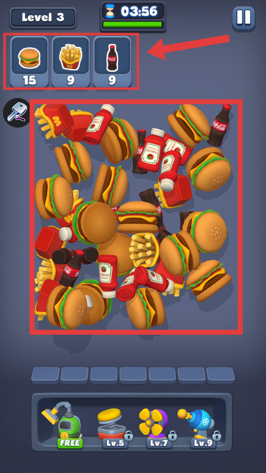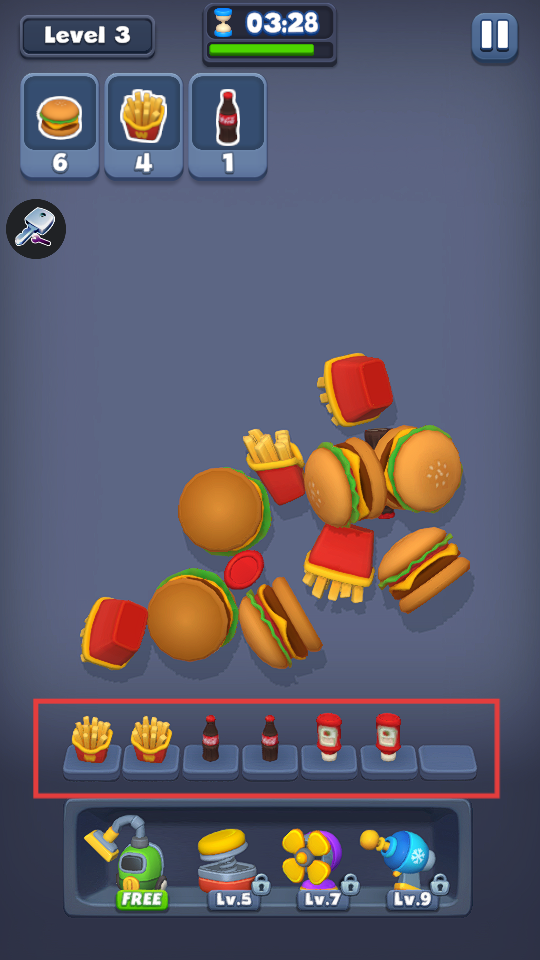 2、进入游戏后,留意屏幕上方显示的【汉堡】【薯条】【可乐】所需数量,快速从下方商品堆中找出对应商品。