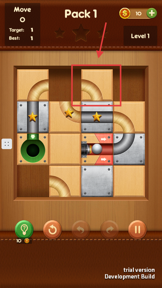 2、移动红色方框内弧形木质方块,调整位置连接滑道,为白球滚动铺路。