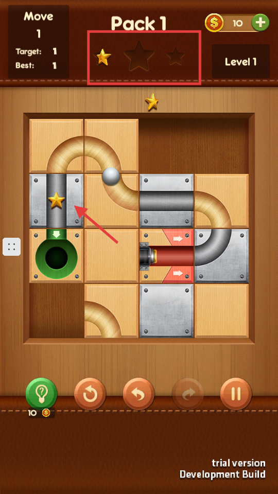 3、调整方块连通滑道,引导白球滚动收集【星星】,推进至目标区域。