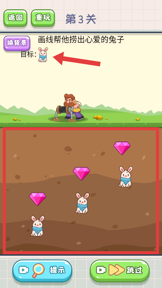 2、进入【第3关】后,明确【画线帮他捞出心爱的兔子】任务目标,观察地下【兔子】和【钻石】分布位置。