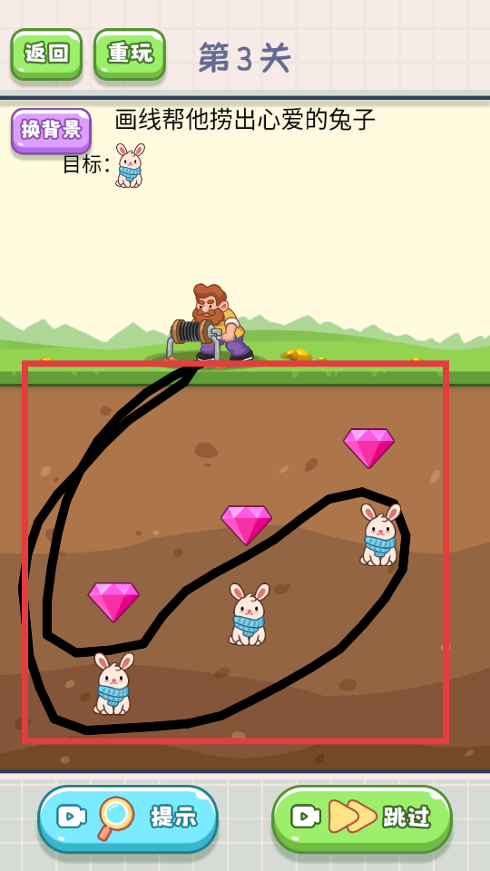 3、通过手指操作,在指定区域内一笔画出线条,尝试引导道具捞出目标【兔子】。