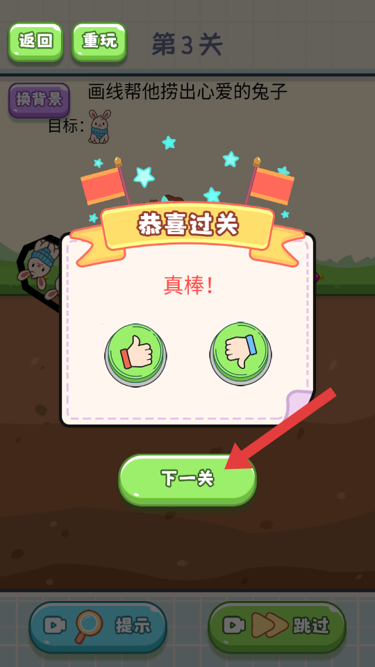 4、成功捞出兔子后,看到【恭喜过关】提示,点击【下一关】按钮,挑战后续关卡。