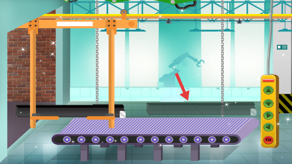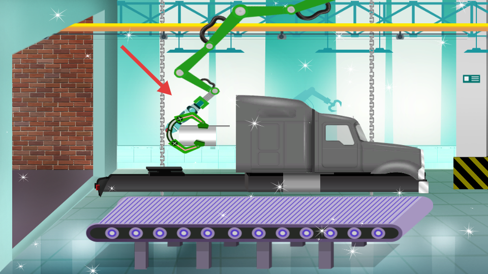 2、在工厂场景中,操作右侧黄色控制按钮,控制机械装置移动,为卡车制造准备部件。