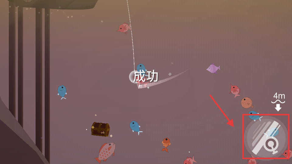 3、钓到鱼后点击右下角收杆按钮,成功收杆获取鱼类,同时可留意周围宝箱资源。